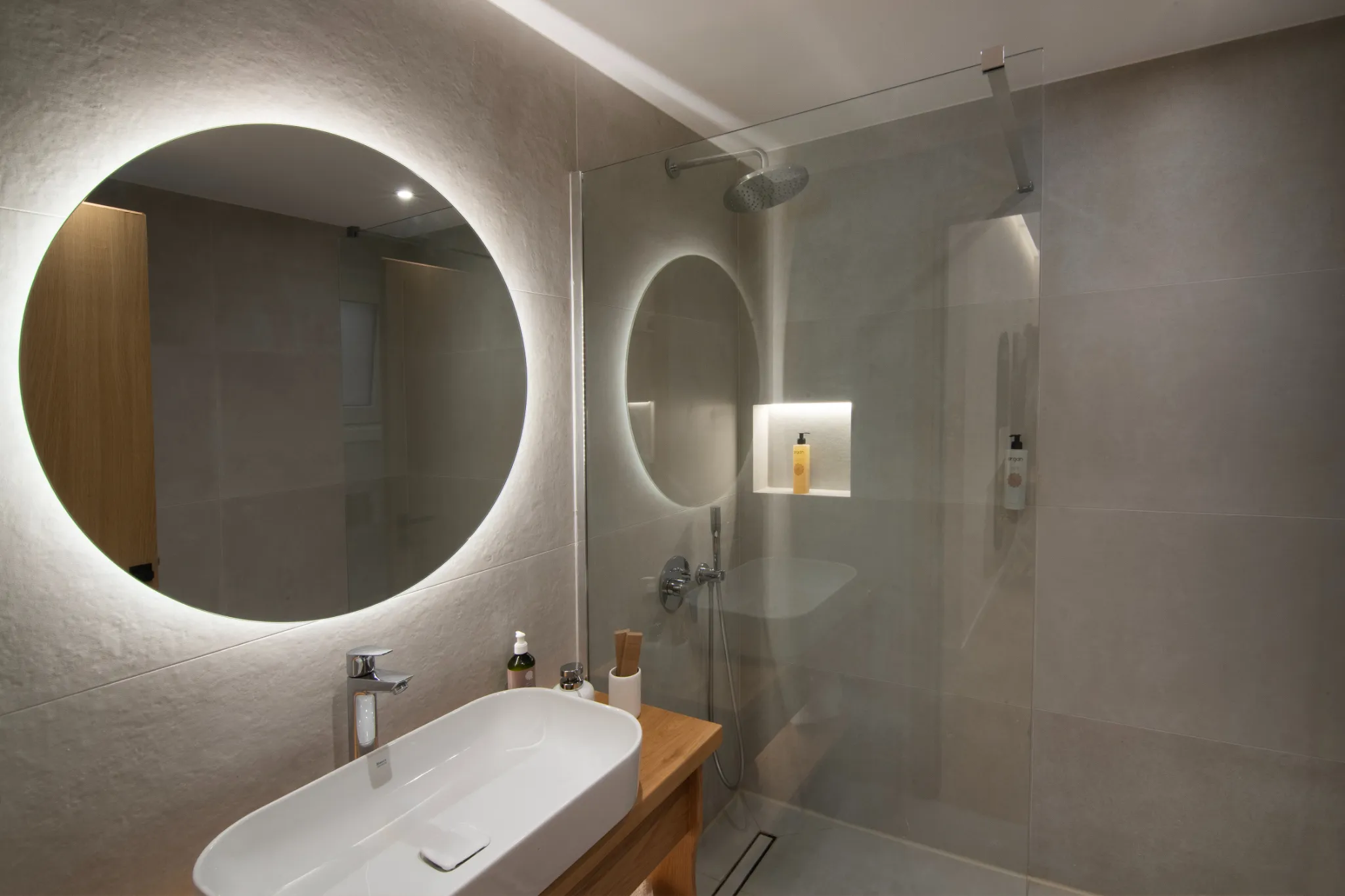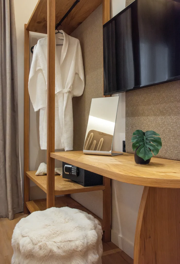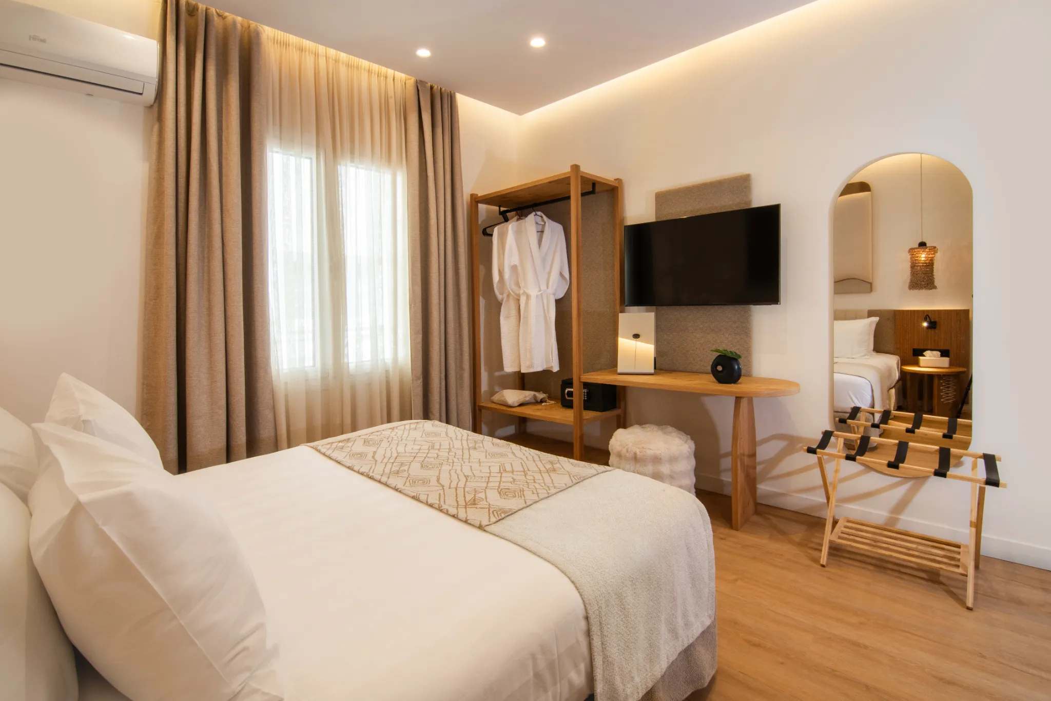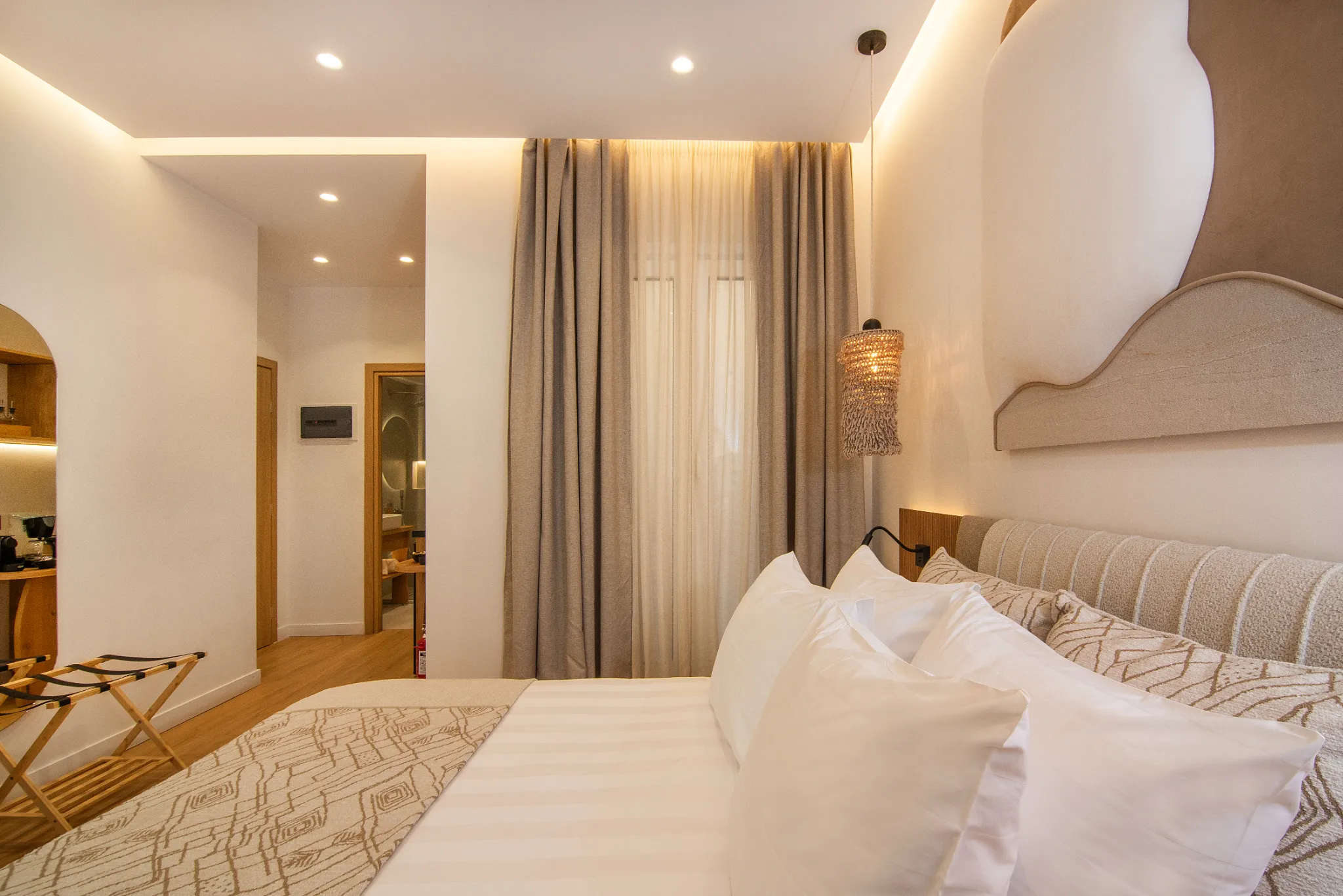 The suite opens onto a furnished private balcony, providing a serene space to unwind. With its warm textures and natural tones, it reflects the hotel’s signature earthy elegance, all just a minute’s walk from the sea.