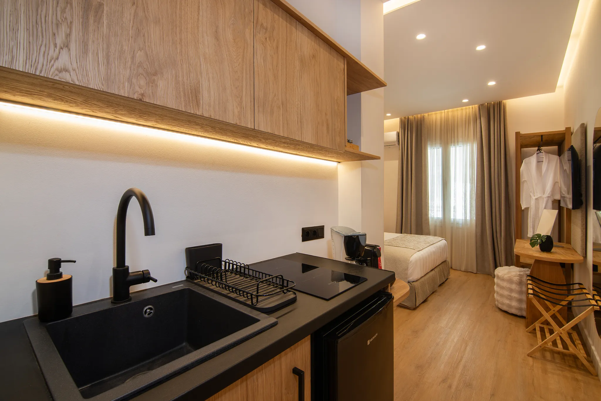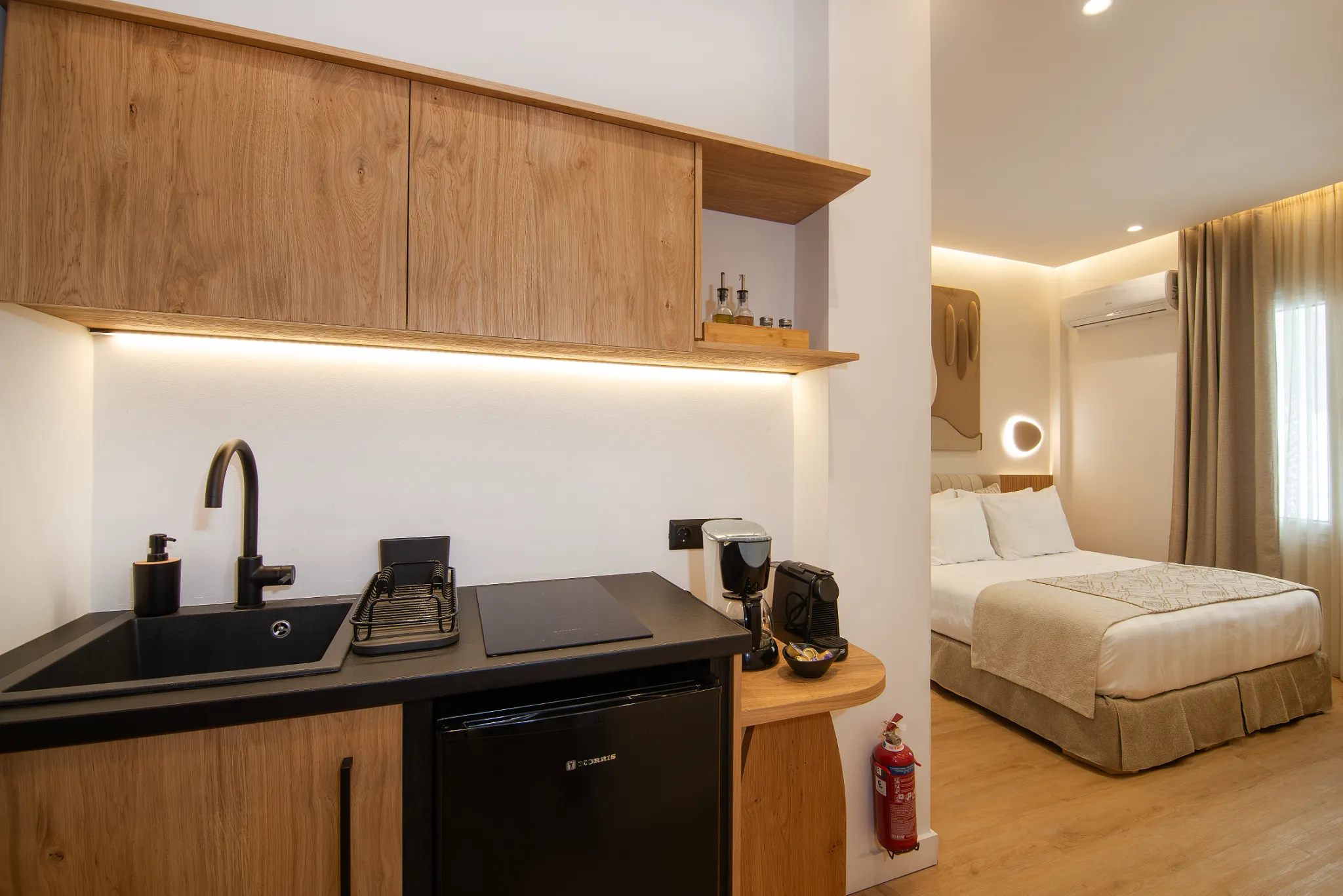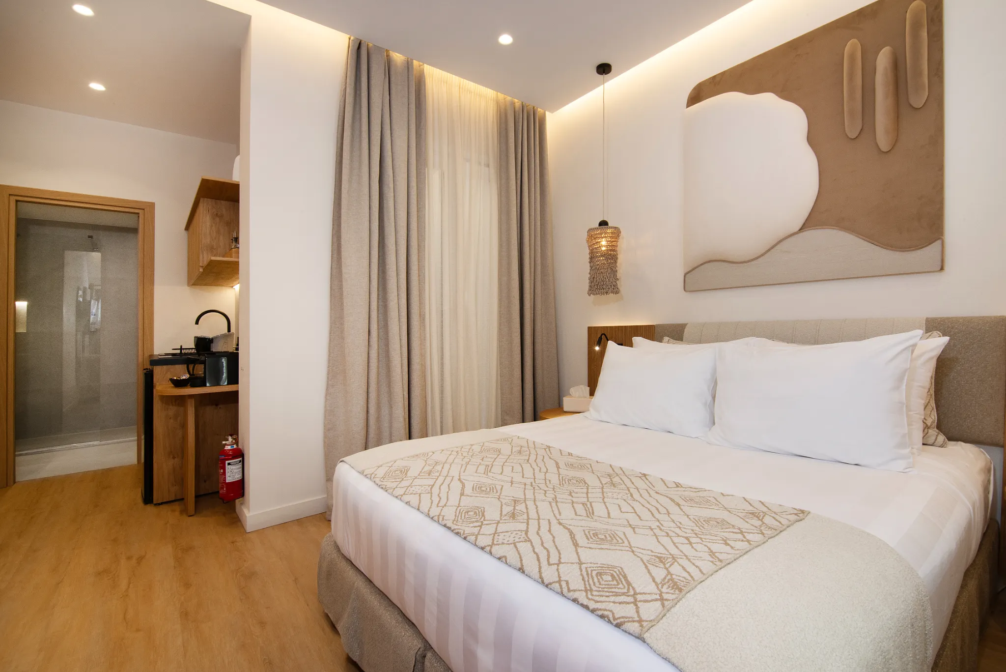 The Standard Suite is a beautifully designed 20 square meter retreat perfect for couples or solo travelers seeking a blend of simplicity and comfort. It features a Queen Size bed dressed in premium linens, a sleek bathroom with modern fixtures and a full shower, and a well-equipped kitchenette ideal for preparing light meals.