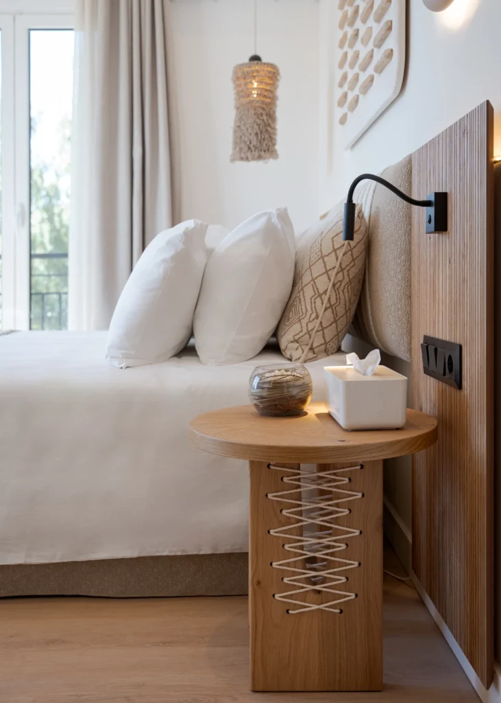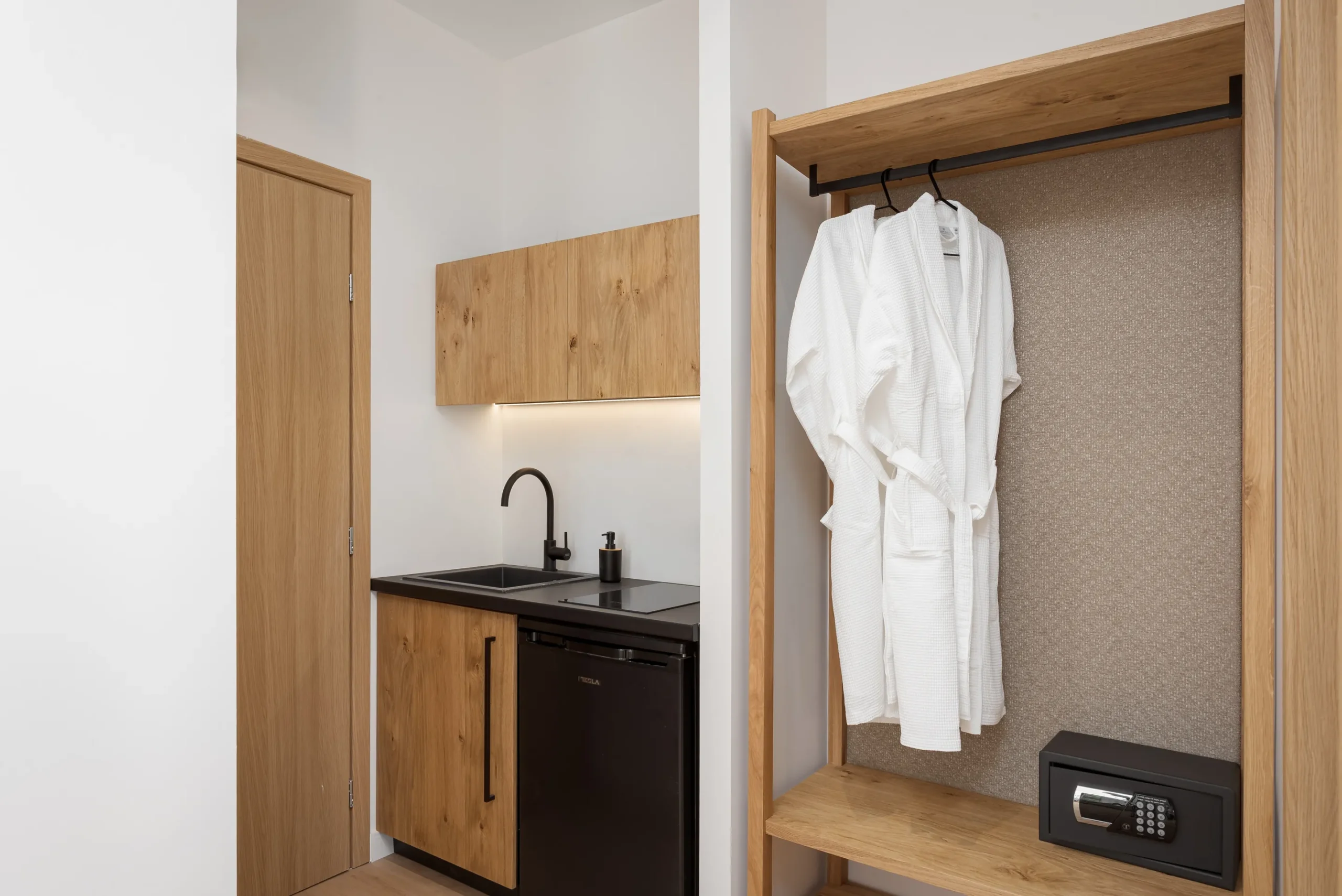 The Superior Suite is a serene, light-filled space offering 20 square meters of comfort and modern elegance—perfect for two guests seeking a peaceful retreat in the heart of Aegina. Thoughtfully designed with a Queen Size bed, a sleek bathroom featuring a walk-in shower, and a fully equipped kitchenette, this suite provides everything you need for a relaxing stay, whether it’s for a weekend escape or a longer visit.